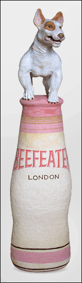 «Бифитер» - скульптура-инсталляция, которая может дополнить как классический, так и современный интерьер. Она трансформируется в отдельные стилевые решения не только концептуально, но и физически, ведь большую пробку на бутылке можно открутить. А коренастый бультерьер, который взгромоздился и твердо уперся упругими лапами, может существовать и сам по себе, оберегая свою статность.