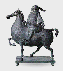 Но не обошлось без мягкой иронии: грозный взгляд воина, его тучное, всем видом угрожающее тело «опирается» на тонкие, босые ноги. Художница не стала надевать на них даже таби – плотные носки, которые носили самураи в древности.Такому лицу, конечно, желательно и коня соответствующего. Автор нарочито акцентирует внимание на радиусе линий груди животного и человека, и столь внушительные объемы не рискует оставить на трех коротких ногах коня, а утверждает композицию на твердом постаменте.